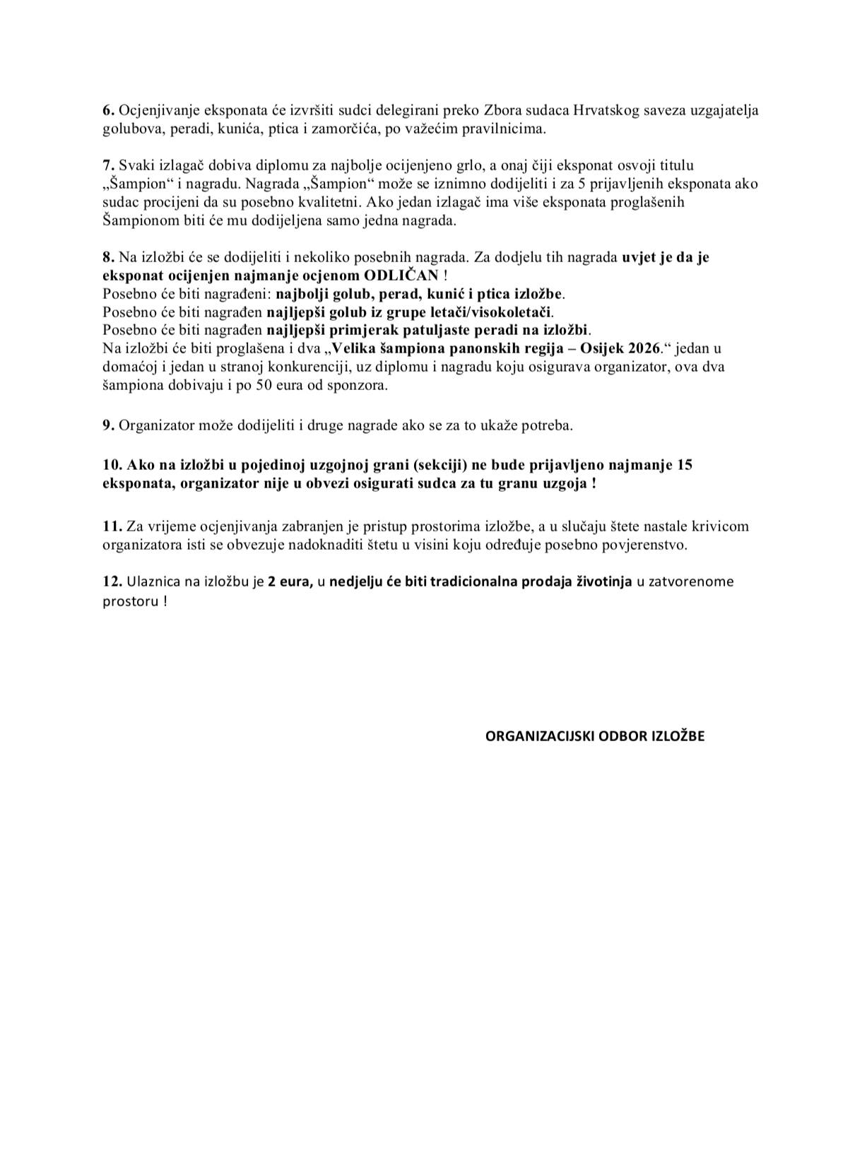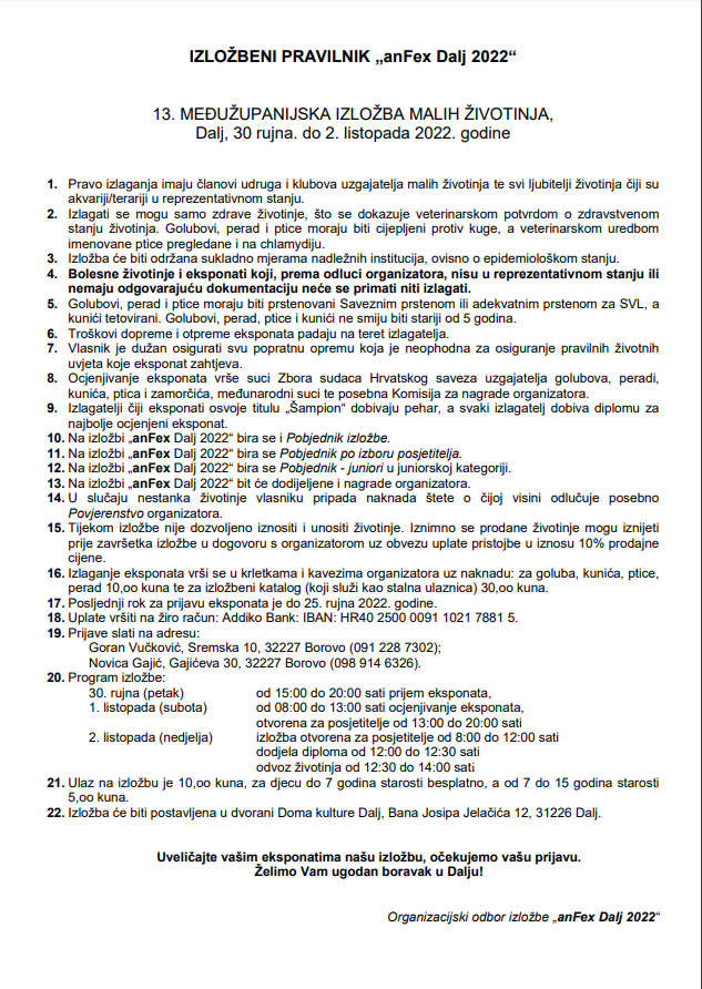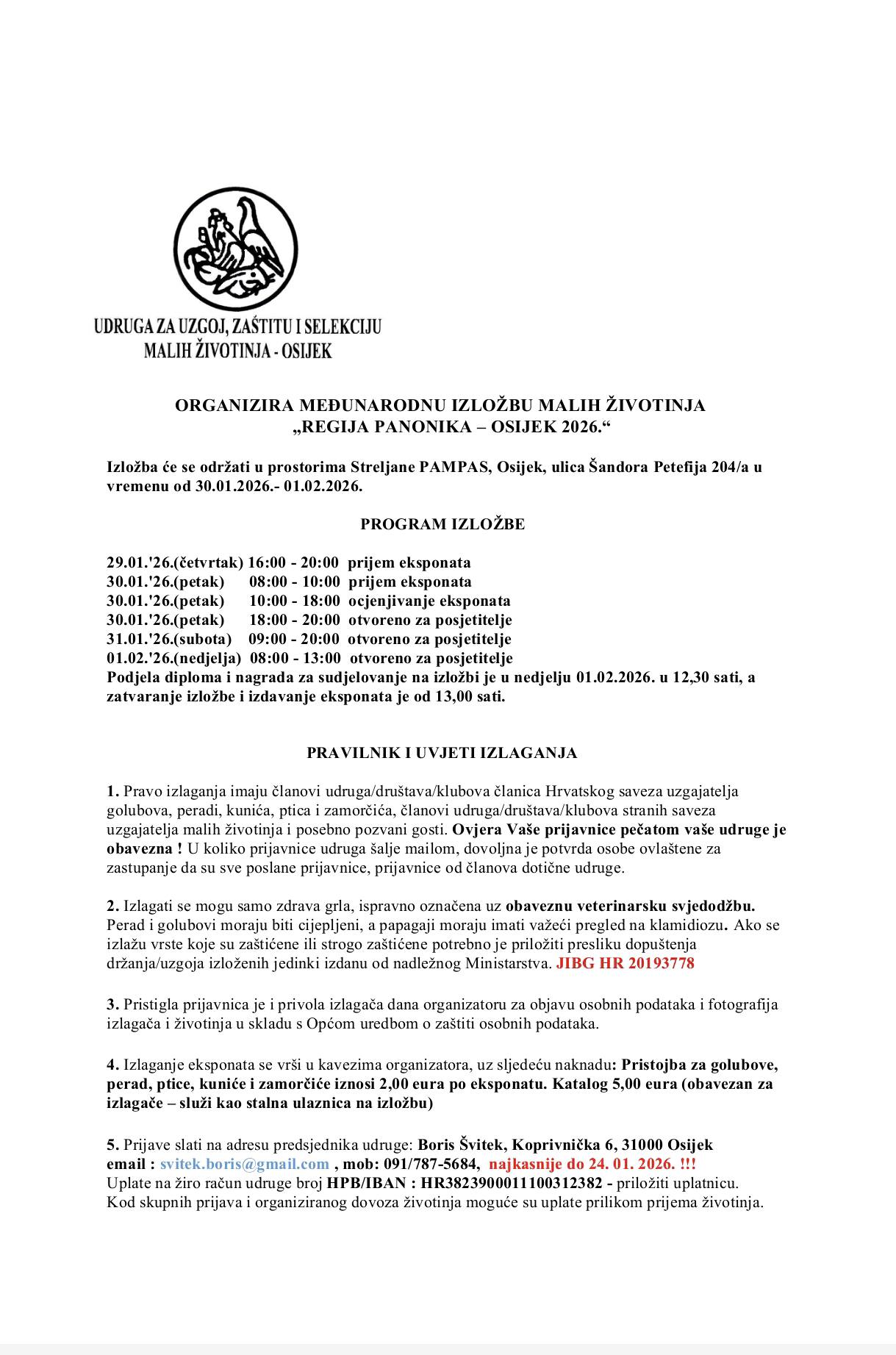 Udruga za uzgoj, zaštitu i selekciju malih životinja Osijek "Osijek 1908.", poziva sve zainteresirane uzgajivače, članove udruga HSUGPKPZ i udruga članica stranih saveza da u skladu s uvjetima učešća, prijave svoje životinje na Međunarodnu izložbu malih životinja, "REGIJA PANONIKA - OSIJEK 2026."Izložba će se održati od 30.01. - 01. 02.2026. u Osijeku, u prostorima streljane "Pampas", ulica Šandora Petefija 204 a.