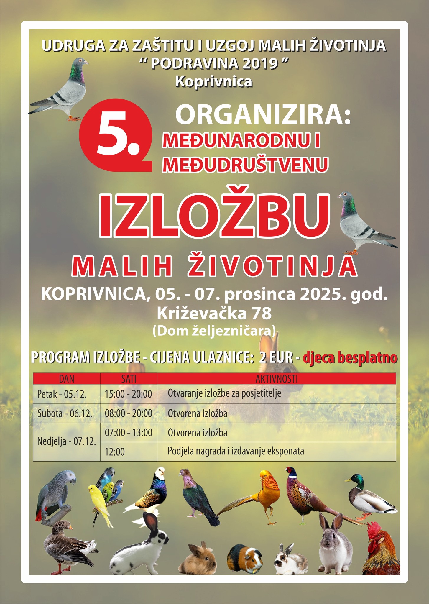 Društvo uzgajivača malih životinja "Mali uzgajivač" Ivanić Grad, poziva sve zainteresirane uzgajivače, članove udruga HSUGPKPZ i udruga članica stranih saveza da u skladu s uvjetima izlaganja, prijave svoje životinje na 32. međugradsku i međužupanijsku izložbu malih životinja.Izložba će se održati od 06 - 08. 02.2026. u Pučkom domu u Kloštar Ivaniću, Trg Sv. Ivana I.
